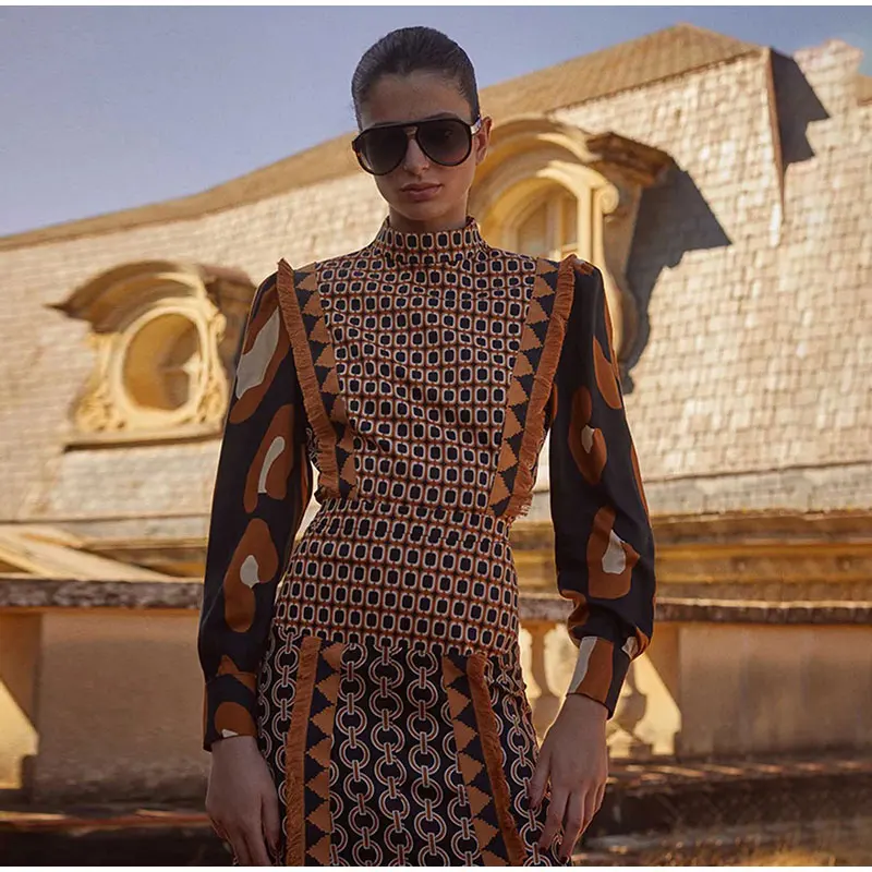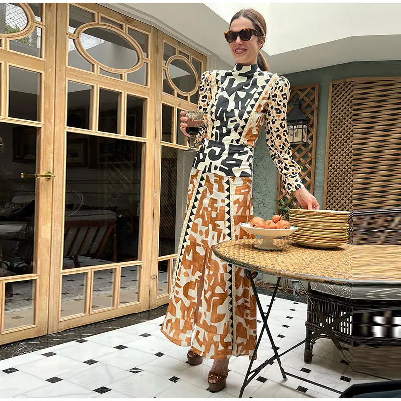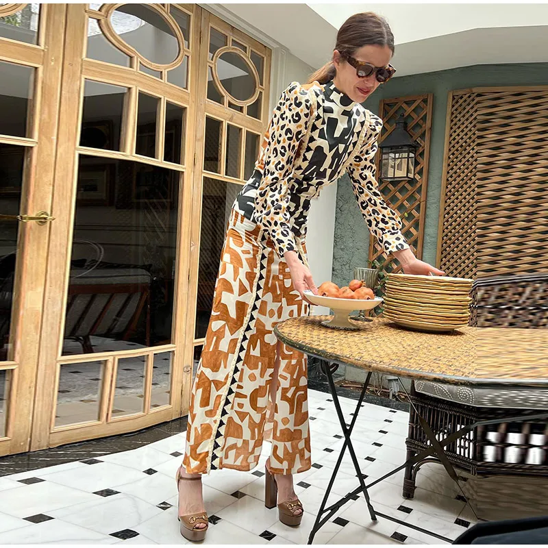 Let’s start with the star of the show: the mock neck long-sleeve top. With its bold pattern and sophisticated mock neck design, this top is guaranteed to turn heads wherever you go.