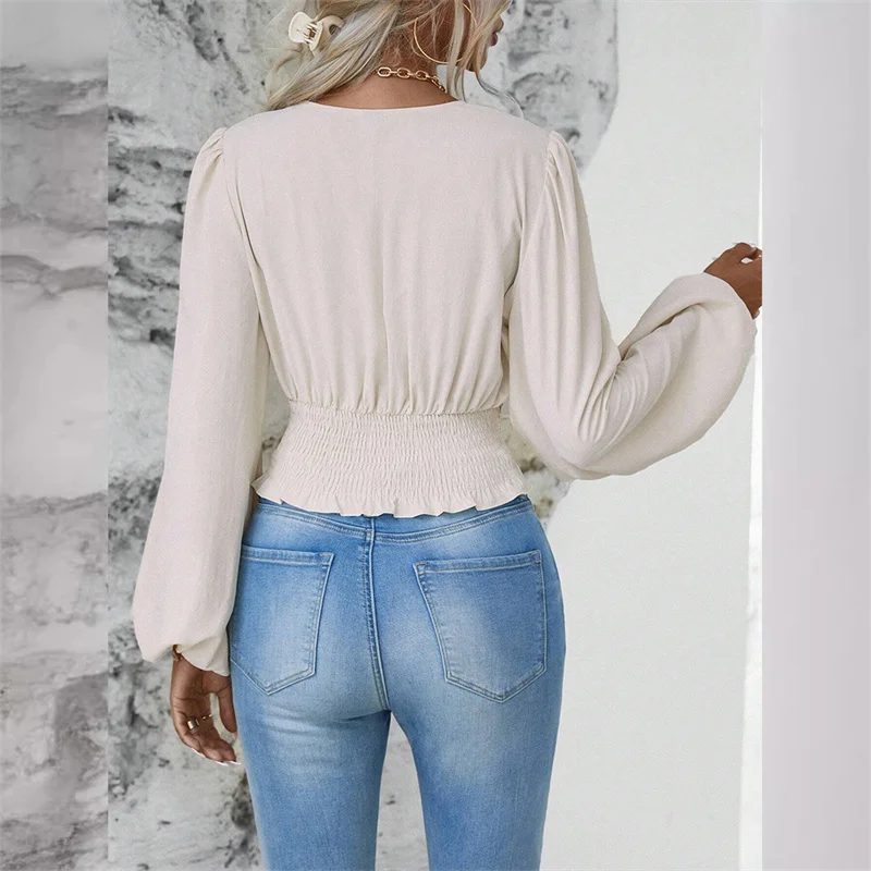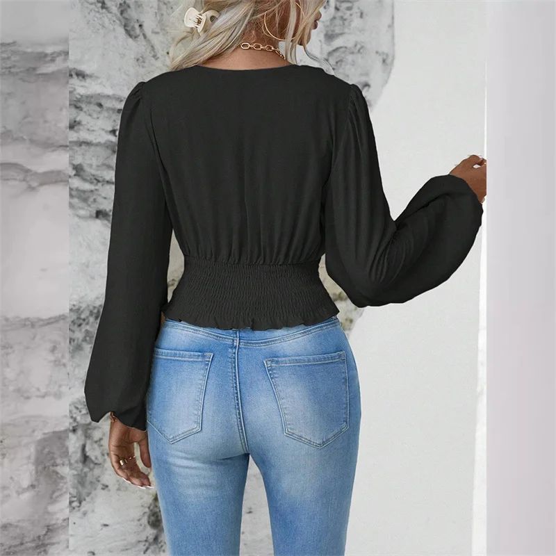 Look no further because the Crossover Deep V-Neck Pullover Skinny Waist Long Sleeve Blouse is about to become your new favorite wardrobe weapon.