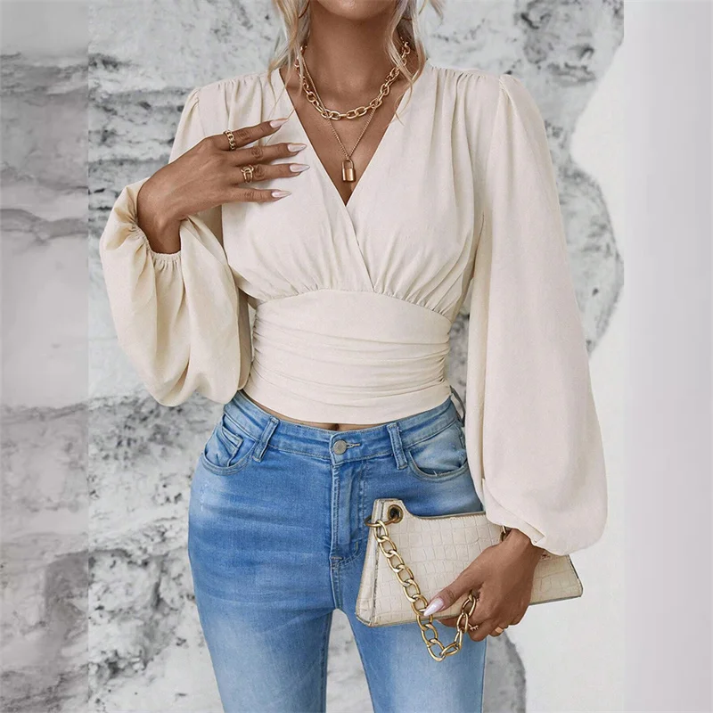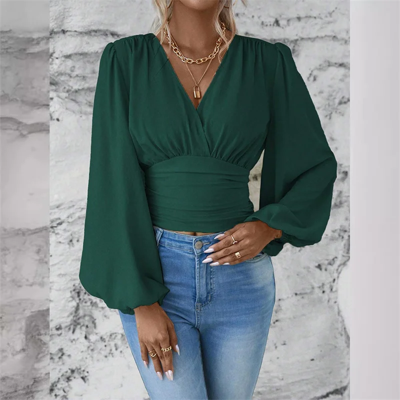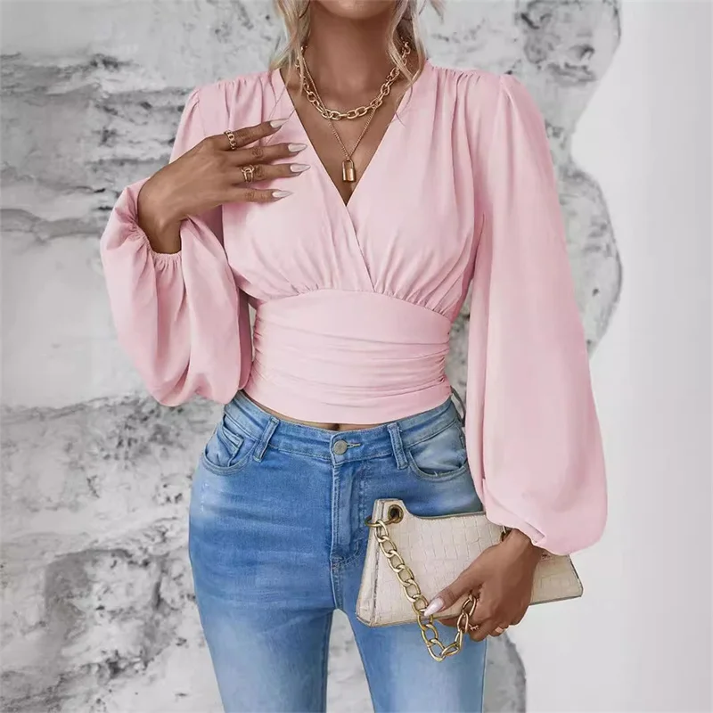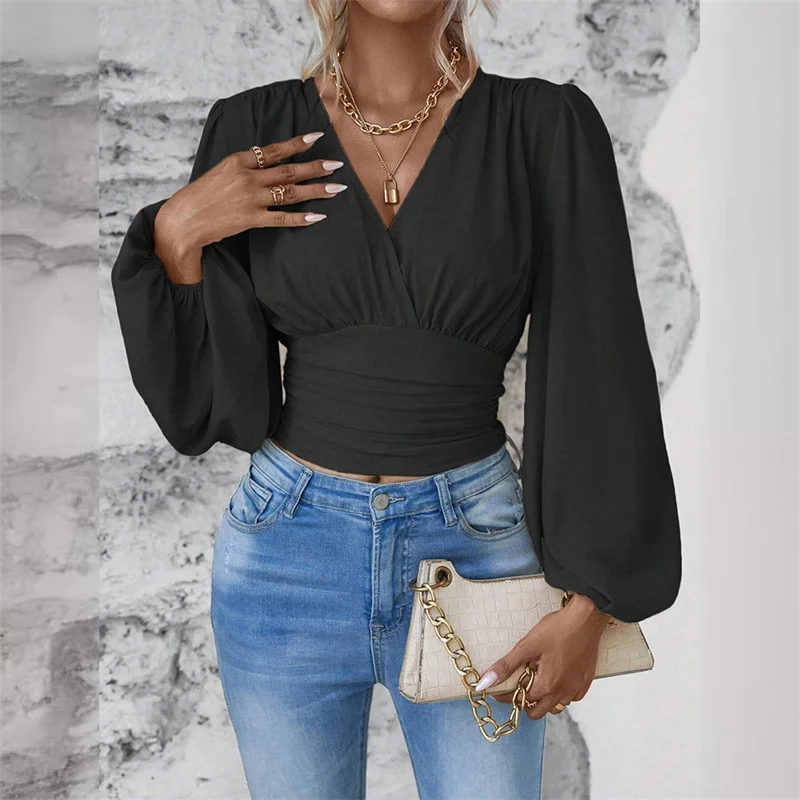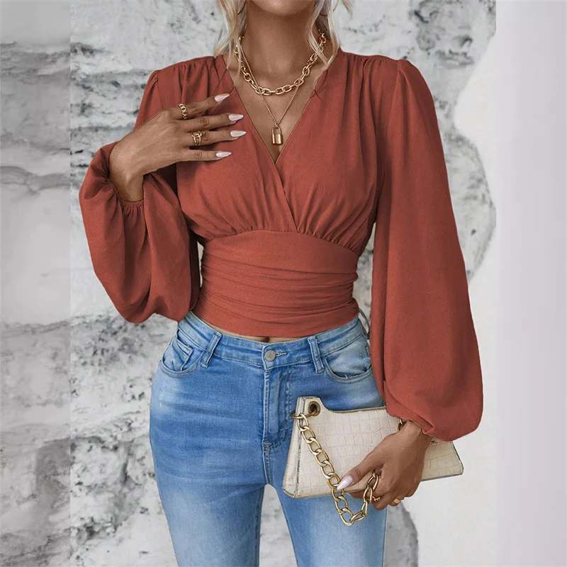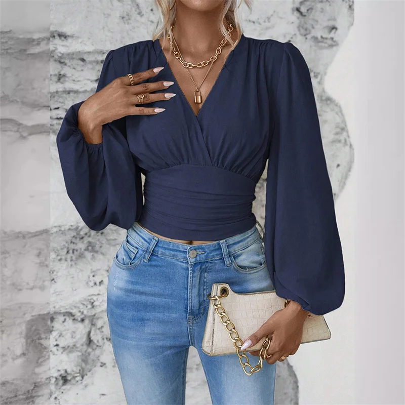 Top Keywords: crossover V-neck blouse, skinny waist blouse, long sleeve pullover, deep V-neck blouse, women’s stylish pullover