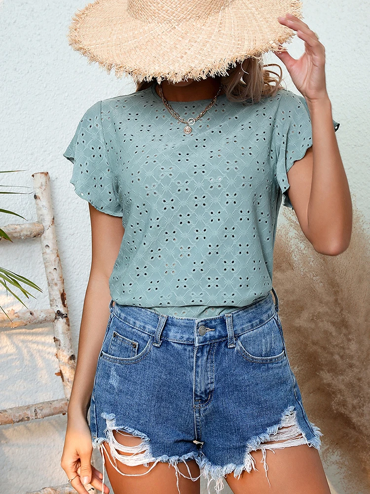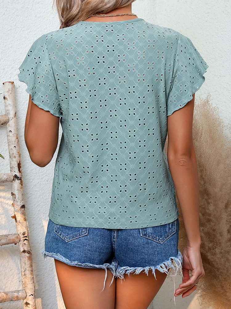 Knitted Hollowed Out Petal Sleeve Round Neck Solid Color Blouse
