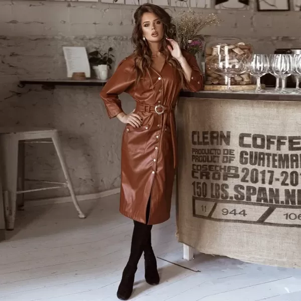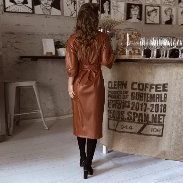 This isn’t just a dress—it’s your new secret weapon. Meet The Midnight Range Rider Dress, a leather dream built for bold entrances, late-night getaways, and owning every room you walk into. With a sleek V-neck, waist-defining spliced waistband, and full-length single-breasted closure, this beauty hugs you in all the right places while keeping things tough, tailored, and timeless.