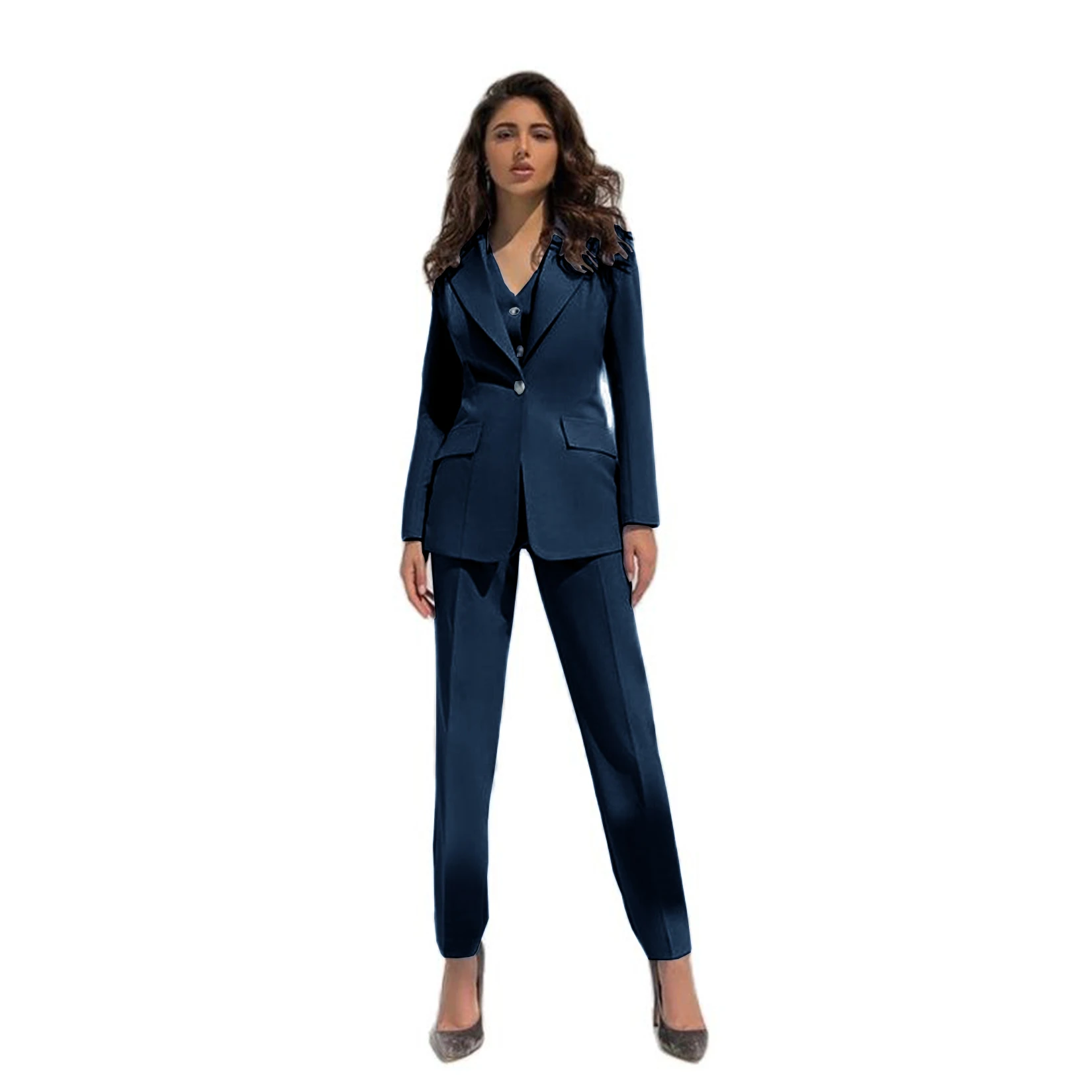 The Sky Blue Women’s Business Pants Suit, comprising a blazer, vest, and pants, seamlessly blends sophistication with contemporary flair, making it an indispensable addition to any wardrobe.
