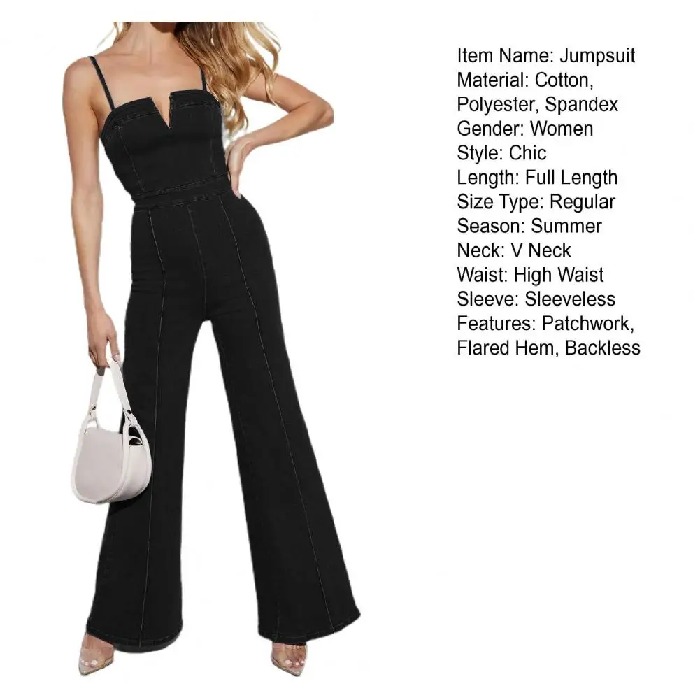 Step into the spotlight with the Slim Fit Back Zip Closure Flared Hem Spaghetti Straps Denim Jumpsuit.