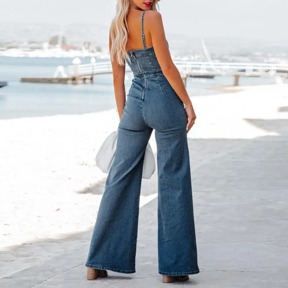 Whether you’re heading to a casual brunch, a night out with friends, or a stylish daytime event, this denim jumpsuit is versatile enough to suit any occasion. Pair it with strappy heels and statement earrings for a chic, sophisticated look, or dress it down with sneakers and a denim jacket for a more laid-back vibe. The classic blue denim wash complements a variety of accessories and footwear, allowing you to create endless outfit combinations.