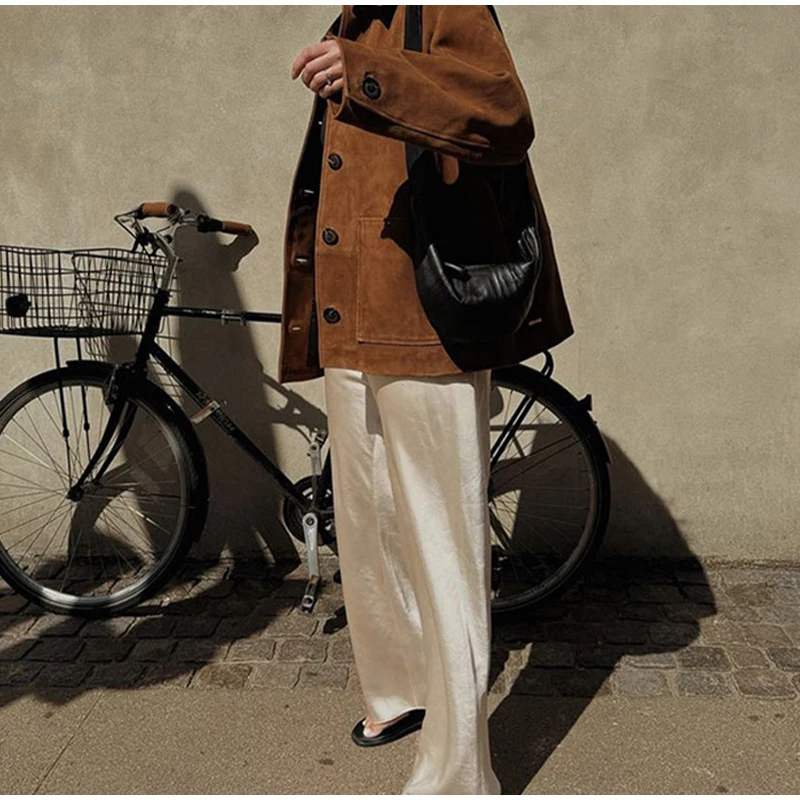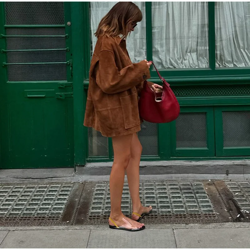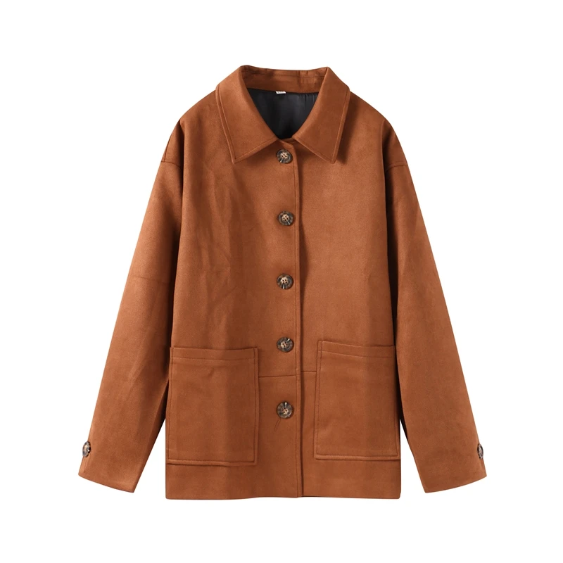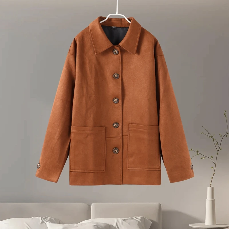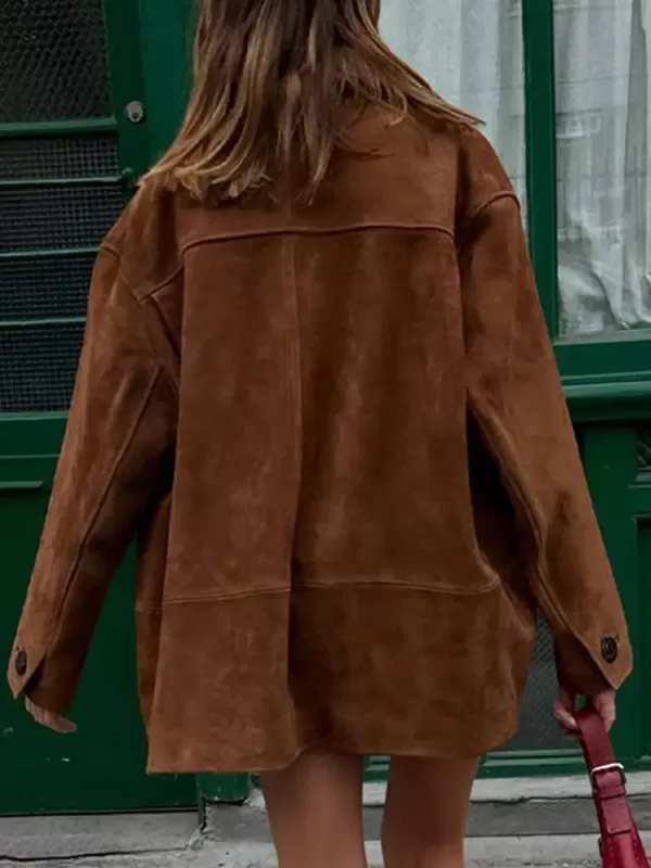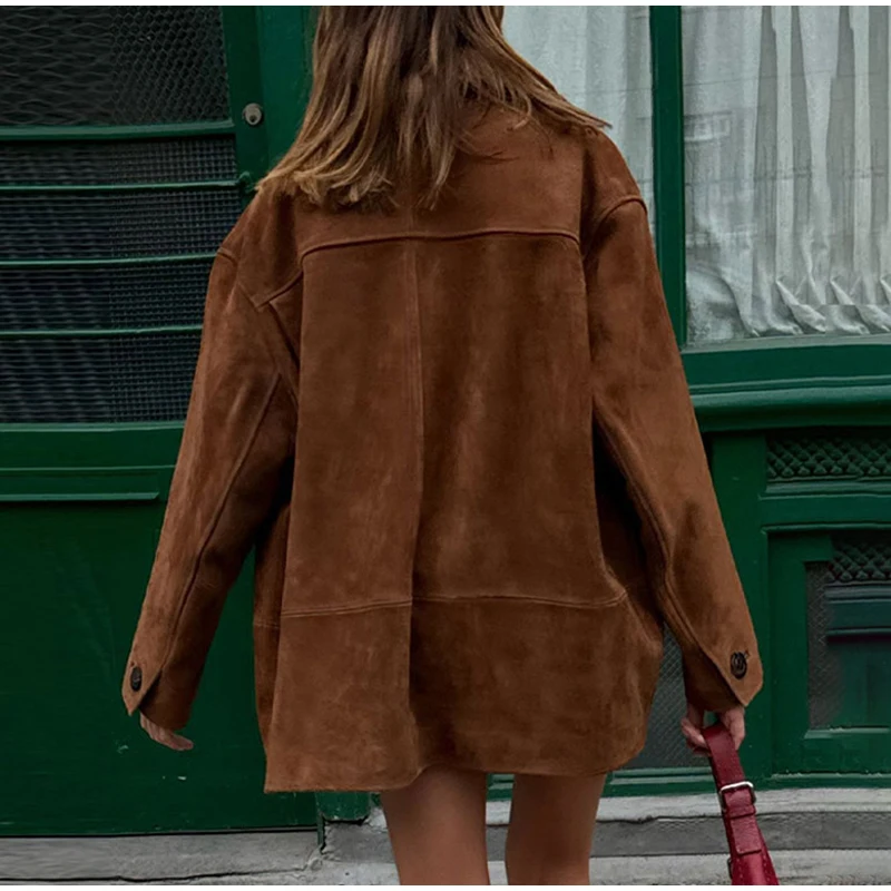 Step into timeless elegance and effortless style with the Vintage Brown Suede Leather Loose Single Breasted Long Sleeves Coat.