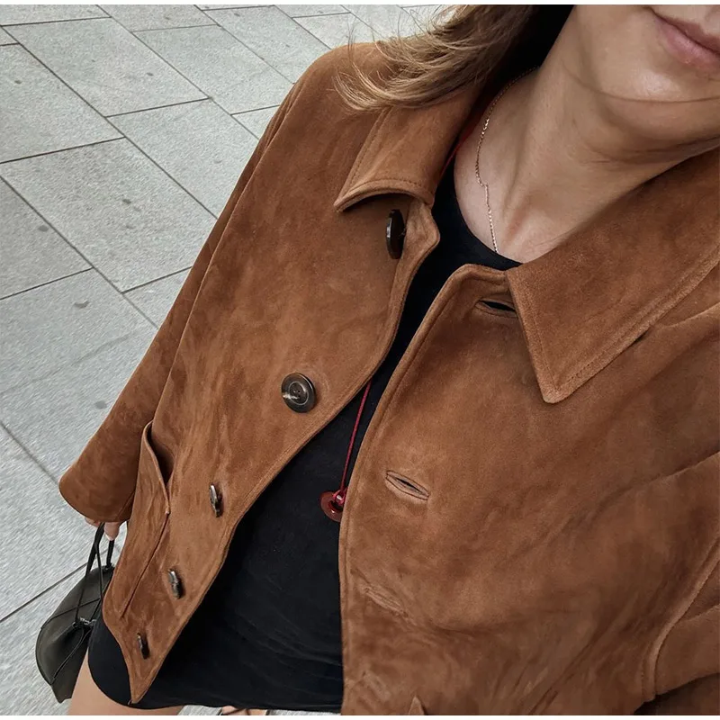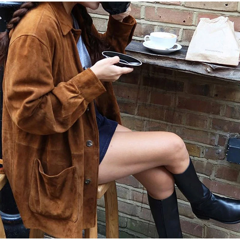 vintage suede coat, brown suede leather coat, loose fit suede jacket, retro leather coat, stylish fall coat, luxury suede outerwear, single breasted leather coat, chic long leather coat, women’s suede jacket