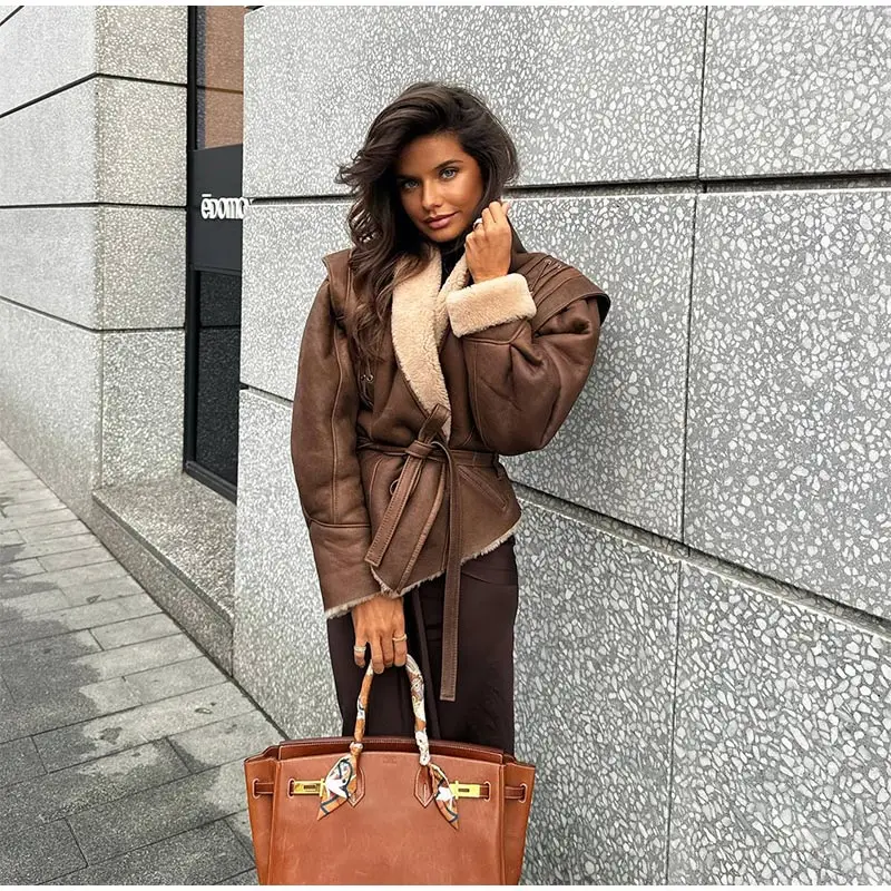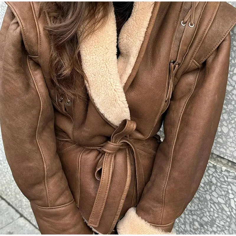 Vintage Lace Up Brown Patchwork Lapel Pocketed Loose Leather Jacket With Belt