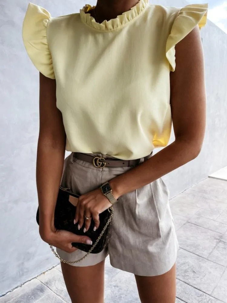 Meet your new go-to wardrobe essential: the Women’s Elegant Ruffled Round Neck Sleeveless Solid Color Casual Shirt—where easy elegance meets everyday comfort.