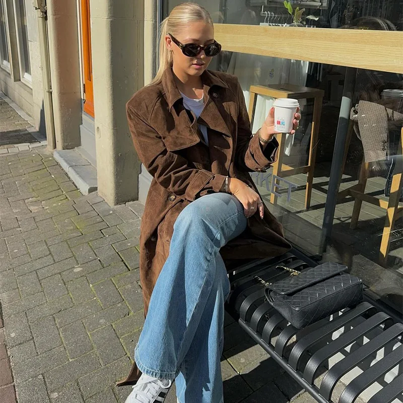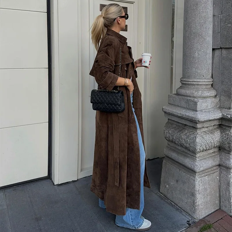 The suede texture? It’s luxury in every touch, while the loose lapel and double-breasted design add effortless sophistication.