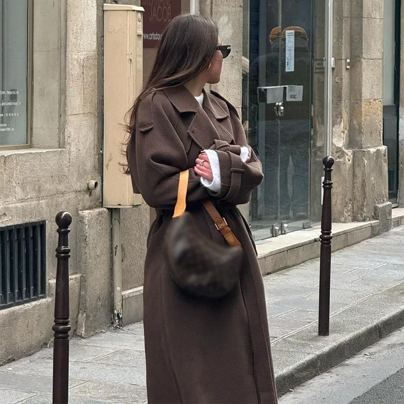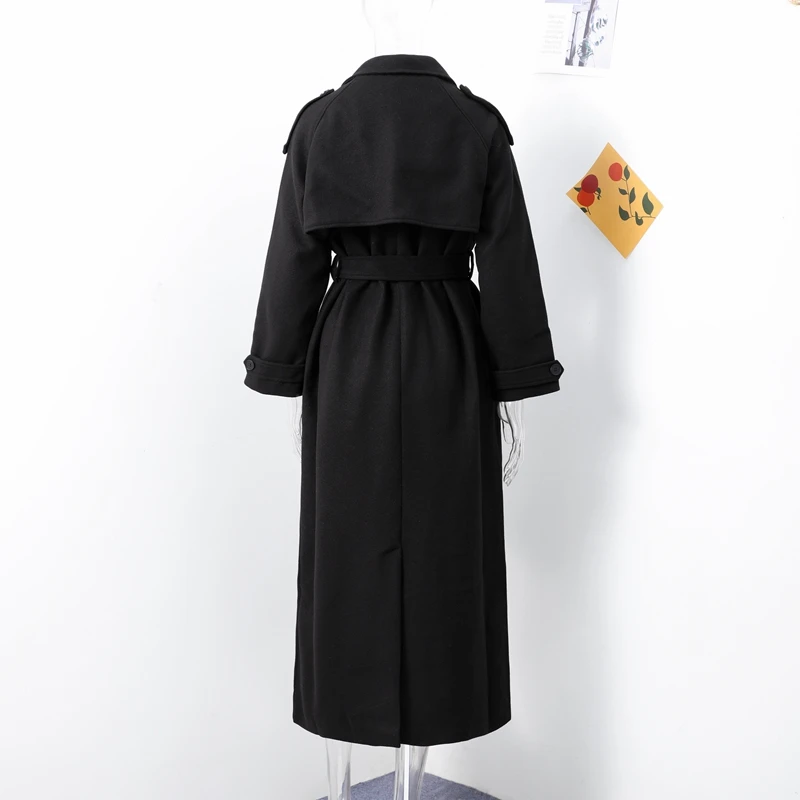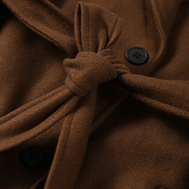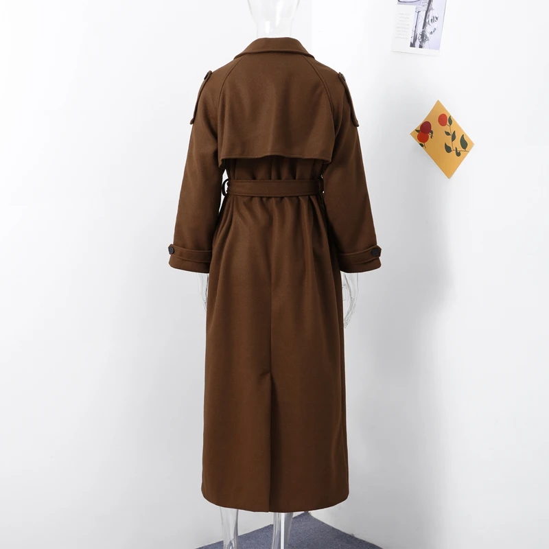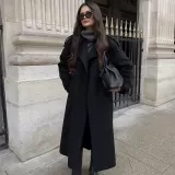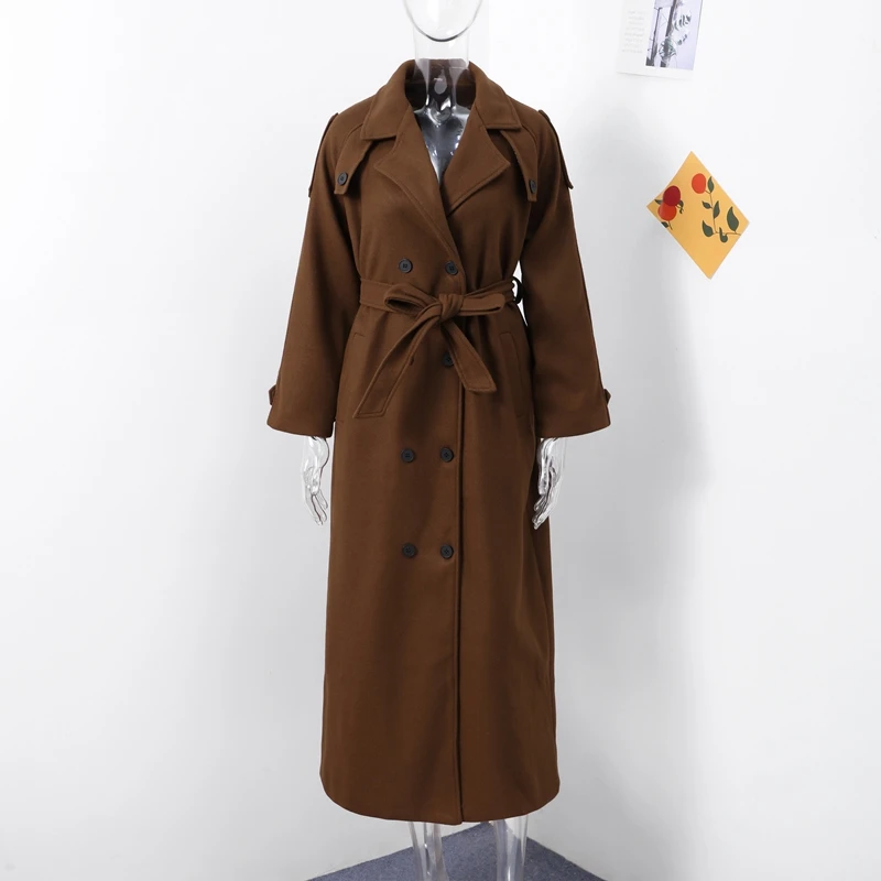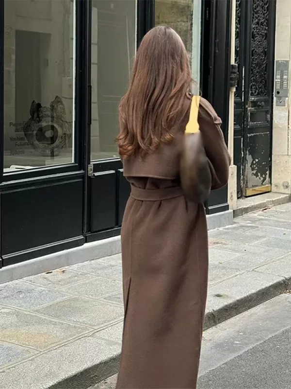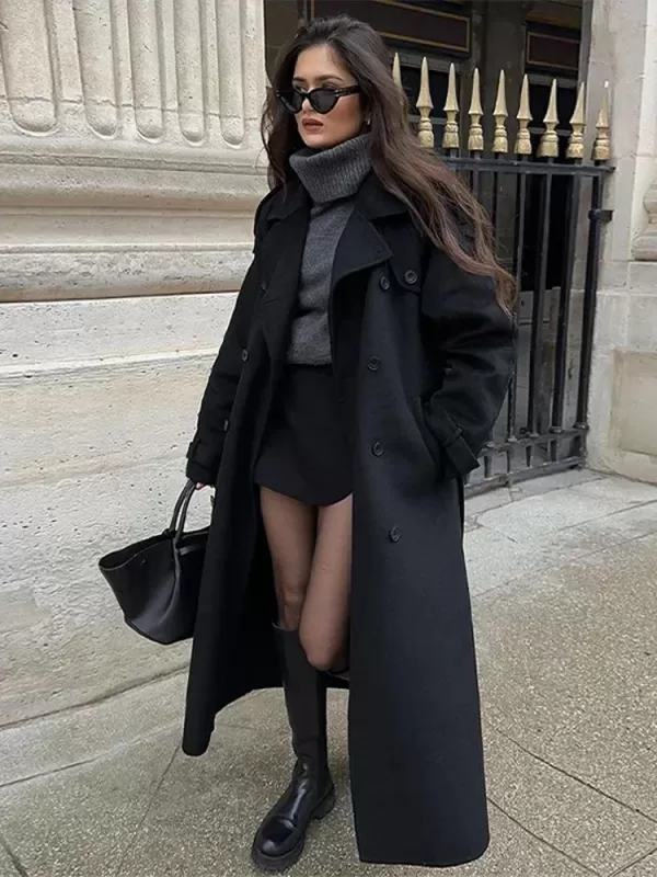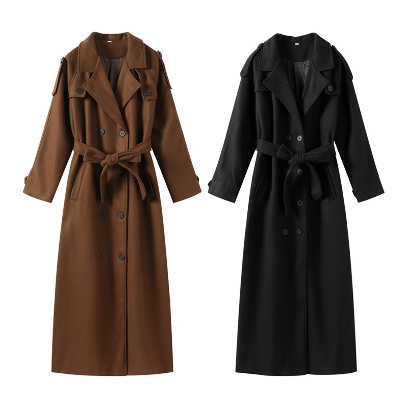 - Keywords: Wool double-breasted coat, women’s winter coat with belt, lapel coat women, solid wool coat, casual wool coat